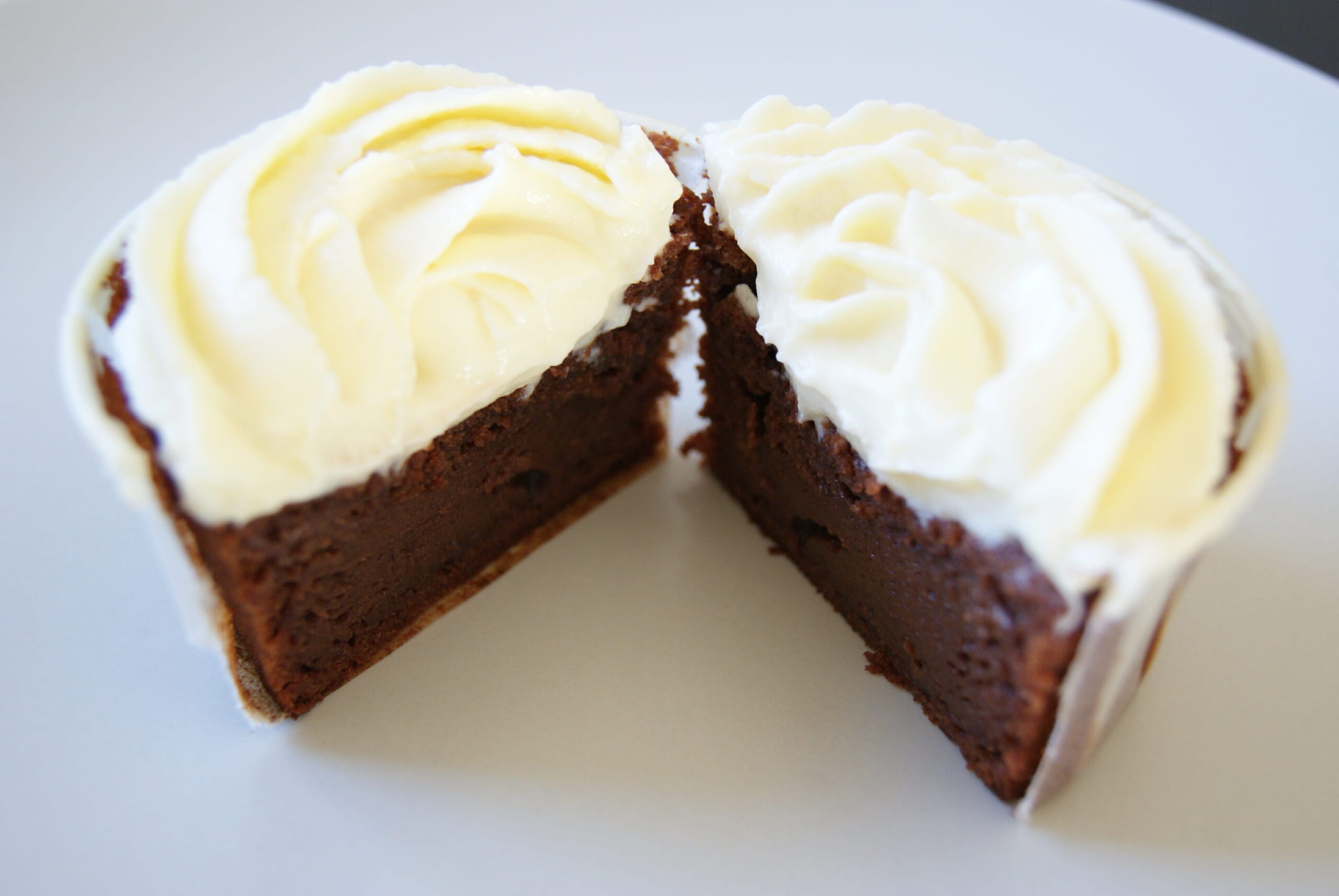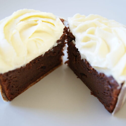 Après les cupcakes vanille & glaçage fondant au chocolat, je suis partie pour l'exact opposé: une base moelleuse au chocolat accompagnée d'un glaçage crémeux vanillé au Philadelphia (avec une petite pointe de beurre).