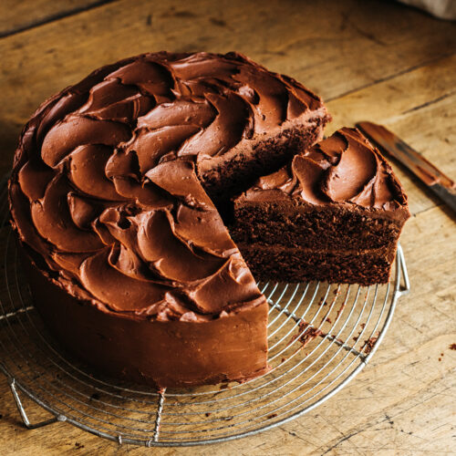 Pour faire le gâteau, on fouette le beurre et le sucre, puis on y ajoute le mélange lait cacao. On termine par les oeufs. D'un autre côté on tamise les ingrédients secs puis on les ajoute petit à petit à la pâte. On la verse ensuite dans 2 moules beurrés et farinés et on enfourne ! Il suffira de laisser tiédir avant de démouler sur grille. Si vous continuez la recette le lendemain, vous pouvez les emballer dans un film alimentaire et les garder à température ambiante.