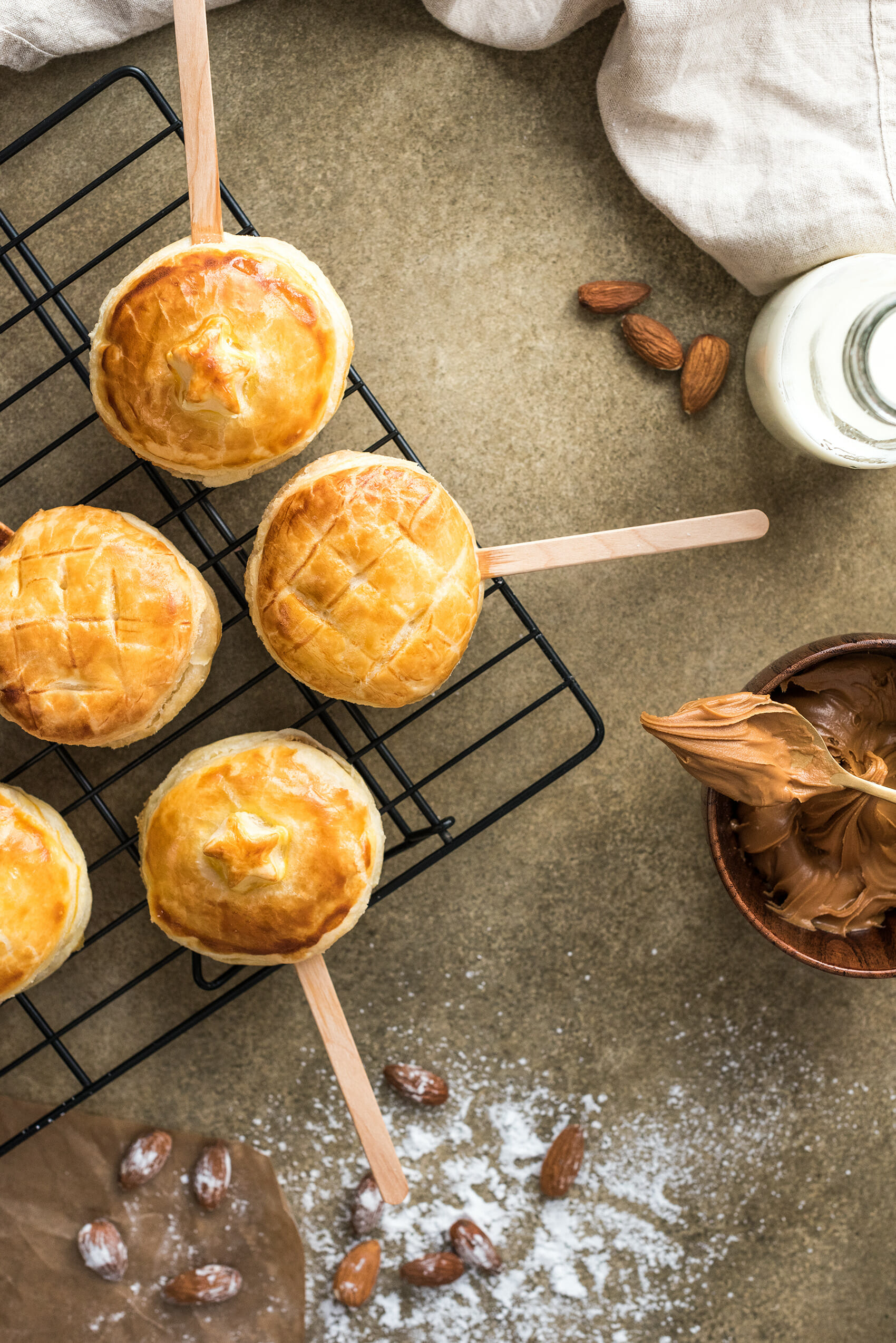 Hello 2018 ! A peine sortis des repas à rallonge de la fin d'année, nous voilà déjà arrivés à l'heure de la galette des rois... Même si on a tendance à se mettre en mode détox après les fêtes (enfin en ce qui me concerne mais je ne dois pas être la seule...) j'ai quand même pris du plaisir à confectionner ces galettes des rois en sucettes frangipane-speculoos. J'aime bien la galette des rois, mais moins le côté traditionnel qui l'entoure. Leur donner une forme de sucette et parfumer la frangipane à la pâte de spéculoos me paraissait une option plutôt sympathique !