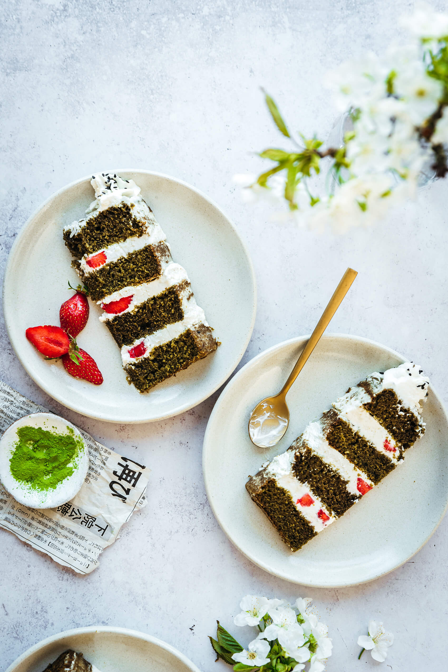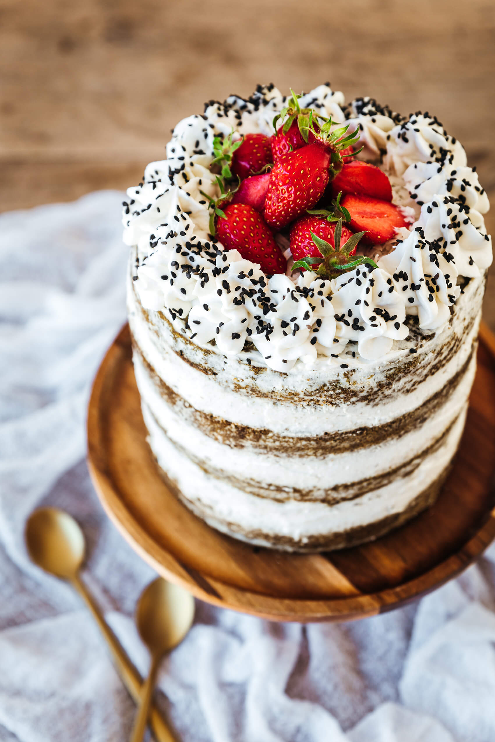 Layer cake au thé matcha, glaçage crémeux noix de coco & fraises (w/ KitchenAid)