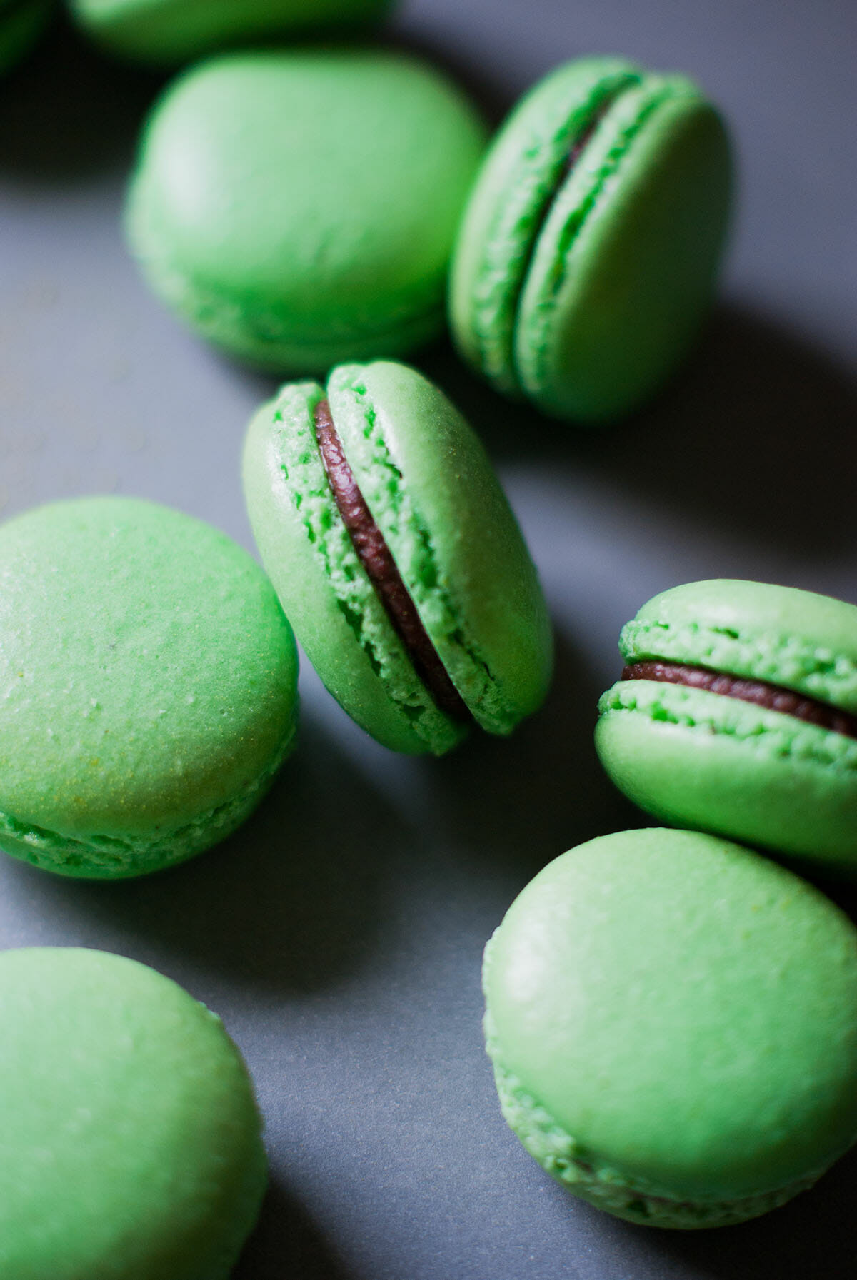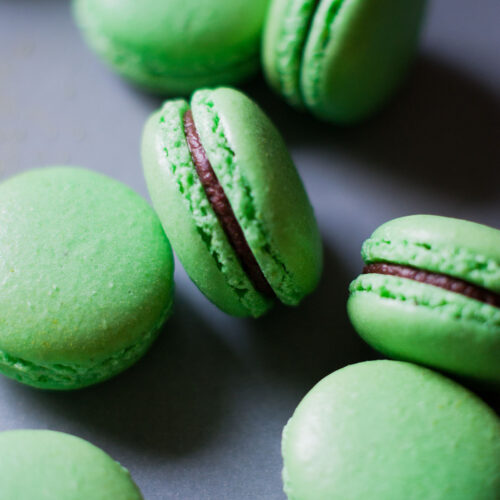 C'est donc parti pour une fournée toute verte! J'ai choisi de parfumer les coques au thé matcha et de les garnir de ganache chocolat noir, les deux saveurs fonctionnent plutôt bien ensemble.