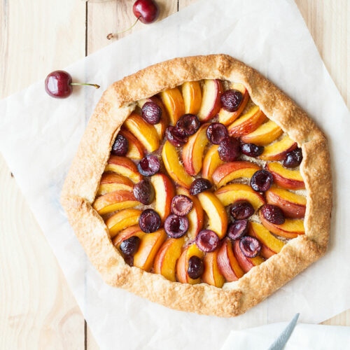 La spécificité de cette tarte - sa simplicité aussi - c'est qu'elle se réalise sans moule à tarte : on replie les bords de la pâte sur elle-même pour l'empêcher de déborder en cuisson, et c'est tout. Rapide, et efficace. Surtout qu'on parle ici d'une pâte brisée toute simple. Et puis, cette forme lui confère un charme particulier vous ne trouvez pas ? Sachez qu'elle se décline à l'envie avec tous les fruits qui vous passent sous la main, c'est donc là l'avantage.